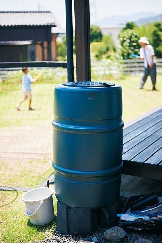 雨どいを経由して雨水をためるタンクを設置。夏場の水遊びや庭の水やりに使用して水道代を浮かします。「災害時の断水の備えにもなり、初期投資の効果は大きいですね」。