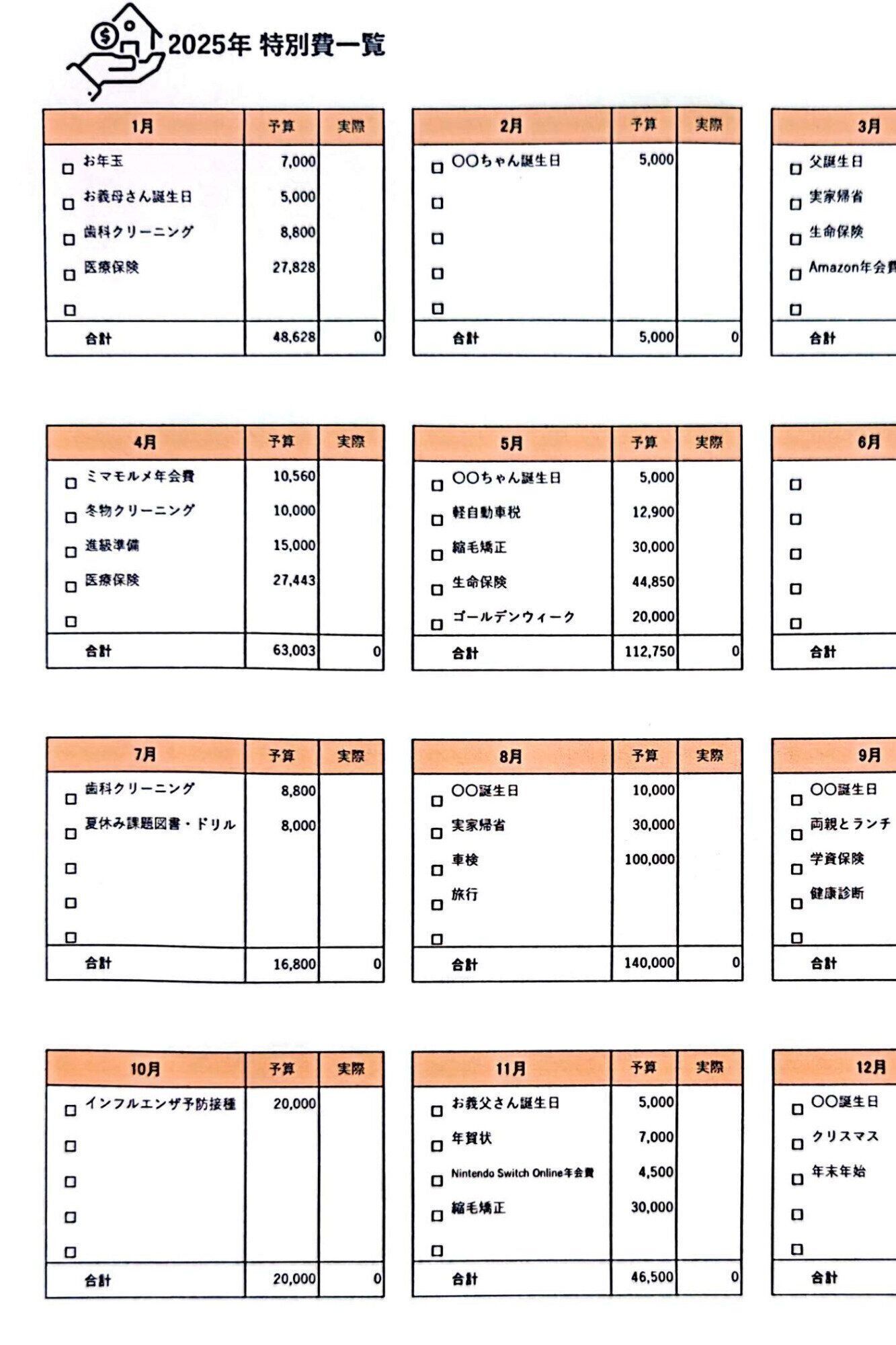 今年のまとめが終わったら、次に取りかかるのは来年のお金のこと。誕生日・クリスマスといったイベントや、年払いの保険料など、日々の予算に組み込みにくい「特別費」を一覧にまとめます。