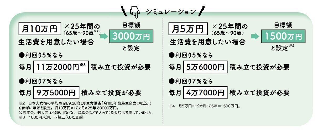 まず投資で備えたい老後資金の目安を出すことです。例えば、65歳以降、公的年金などのほかに生活費として月10万円必要になると仮定すると、65歳から90歳までの25年間の老後資金は3000万円となります。この金額を50歳からの15年で積み立て投資するには、月いくら必要かを逆算。金融庁のWebサイト「つみたてシミュレーター」を使うと計算できますよ。