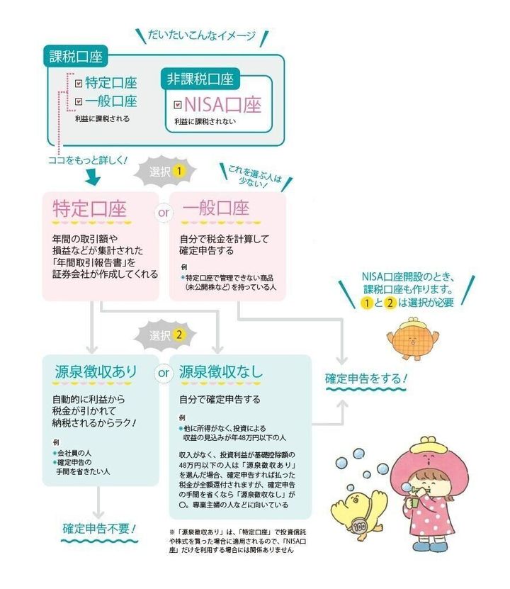 証券会社のサイトでNISA口座を開設しようすると、「特定口座」または「一般口座」を選択し、さらに源泉徴収「あり」「なし」を選択することに。ここでつまずく人が結構いますが、悩まなくても大丈夫。特定・一般口座とは、銀行に例えると普通預金口座のようなもの。先に普通預金口座を作らないと、定期預金口座(NISA口座)を作れない仕組みだと考えて。まずは「特定口座」を選択して、源泉徴収「あり」「なし」を決めると、「NISA口座」も作れます。