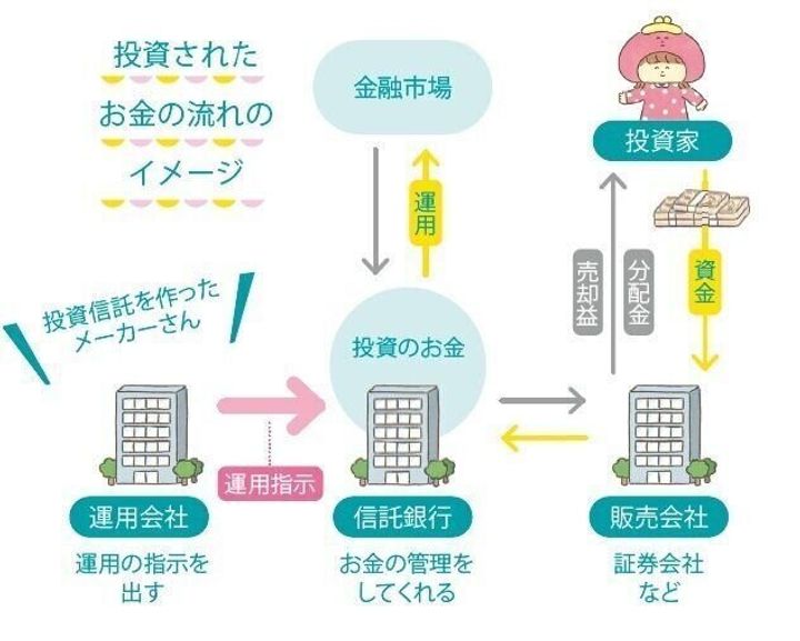 投資したお金は、信託銀行で保管・管理され、運用会社の指示に従ってさまざまな株などを買って運用。その運用利益が投資家に還元される仕組み。投資家のお金は販売会社、信託銀行、運用会社の資産とは別に管理されているので、どこが破綻しても守られます。
