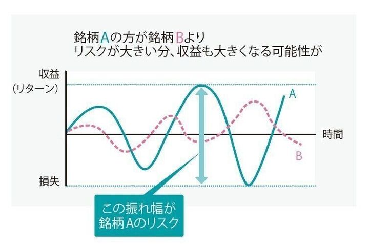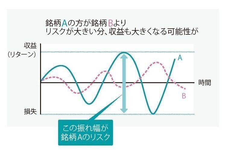 投資でいう「リスク」とは、投資したお金が減ったり、増えたりする「振れ幅」のこと。リスク=振れ幅が大きいほど、結果がどうなるか不確実になります 。つまり、大儲けする可能性もあるけど、大損することもあり。一方、元本保証のノーリスクの金融商品は、損はしませんが、決められた利息以上に増えることもありません。「投資にはリスクがあります」とは、「結果が確定していないのでお金が増えたり、減ったりしますよ」という意味です。