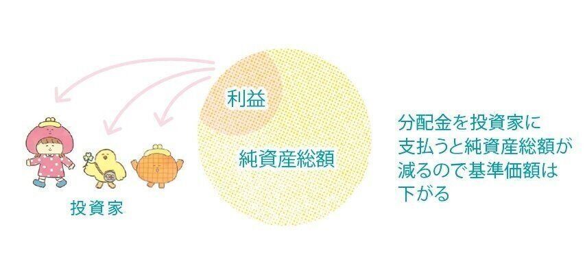 支払いは年1回、毎月、分配金なしなど投資信託によってまちまち。保有口数に応じて分配金を算出。分配金の金額が増えるか減るかは運用次第で、運用成績が良くないと支払われないことも。投資信託を買う際には、分配金を「受け取る」または「再投資」のどちらかを選択し、途中変更もOK。分配金は純資産総額から支払われるので、分配金を払うと基準価額が下がりますが、再投資に回された分は純資産総額の減額には影響しません。