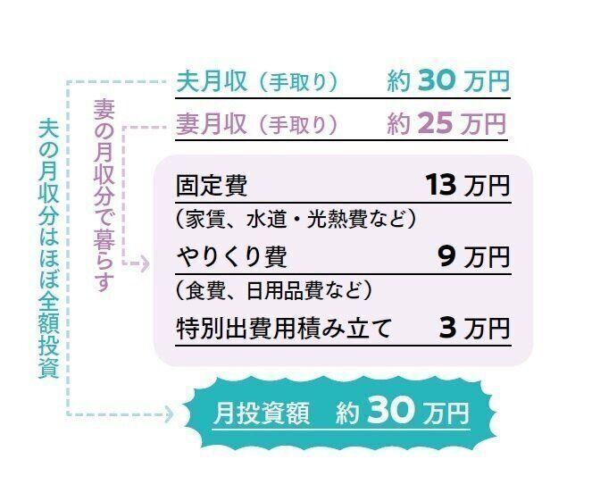 まな家の場合、家賃を含む生活費は妻の月収でまかない、夫の月収は夫小遣い以外は全額投資に。さらに夫婦のボーナスも投資に回していました。「入金力を上げるほどリターンが期待できるので頑張りました」。