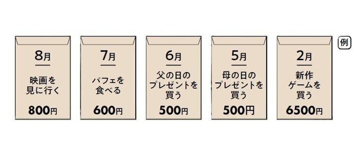 やりくり予算を袋分けする要領で、封筒にお金を使う月とイベント内容、予算を記入。お年玉が余りそうなら「その他」の袋を作ってもOK。
