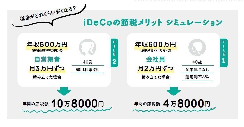 iDeCo(確定拠出年金)は、公的年金とは別に自分年金が作れる制度。毎月の掛け金で運用商品を選び、長期運用することで老後資金が準備できます。iDeCoの掛け金は小規模企業共済等掛金控除として申告することで、全額が所得税控除の対象になるのがメリット!iDeCoの掛け金が多いほど、その年の住民税と所得税が少なくなります。さらに、通常、投資で得た利益には税金がかかりますが、iDeCoで運用期間中の利益は非課税、受け取り時も一定額までは非課税なので、節税効果が高いのが特徴です。