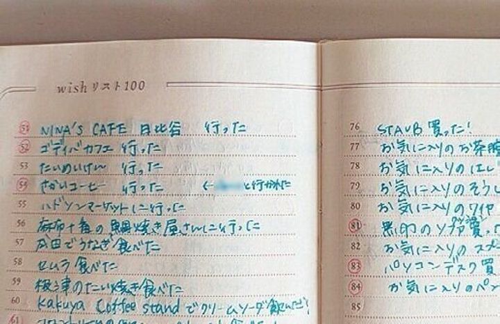 手帳に叶えたい“使い方”を50~70項目記入。新年に、新しい手帳に未達成のことを書き写しながら新しい項目を追加。いくつ叶ったかを見るのも励み。
