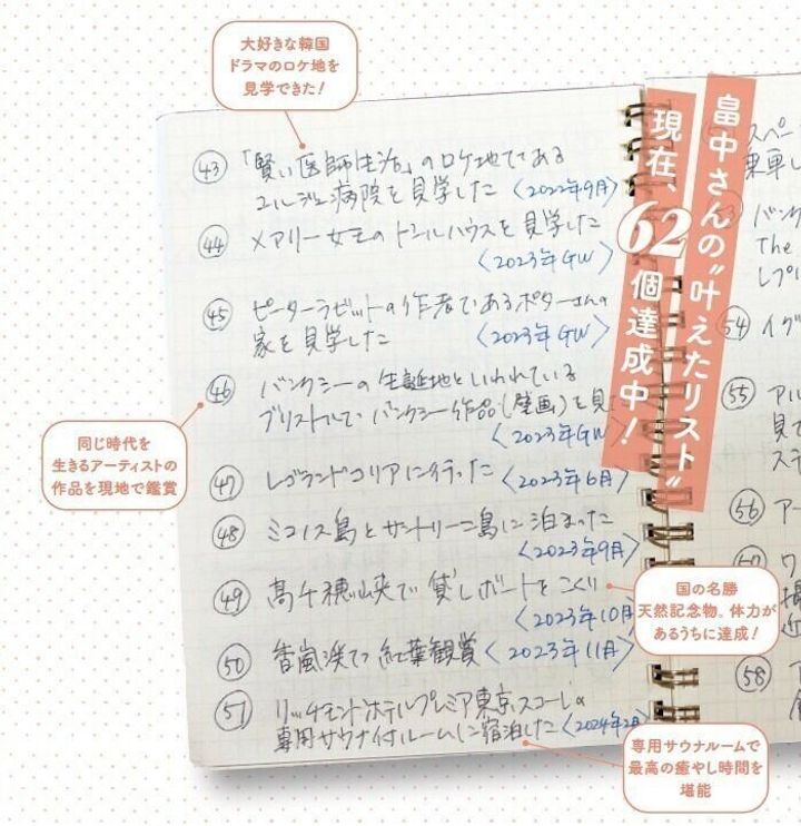 畠中さんがバケットリストの存在を知ったのは、ある海外映画。余命を宣告された主人公がバケットリストを作り、1つずつ叶えていく姿に心を打たれて、作成したそう。「自分で書いた目標を達成することは、この上ない幸せだと気づきました。この先も年齢やお金を言い訳にしないで、楽しみながら人生を全うしたいです」。