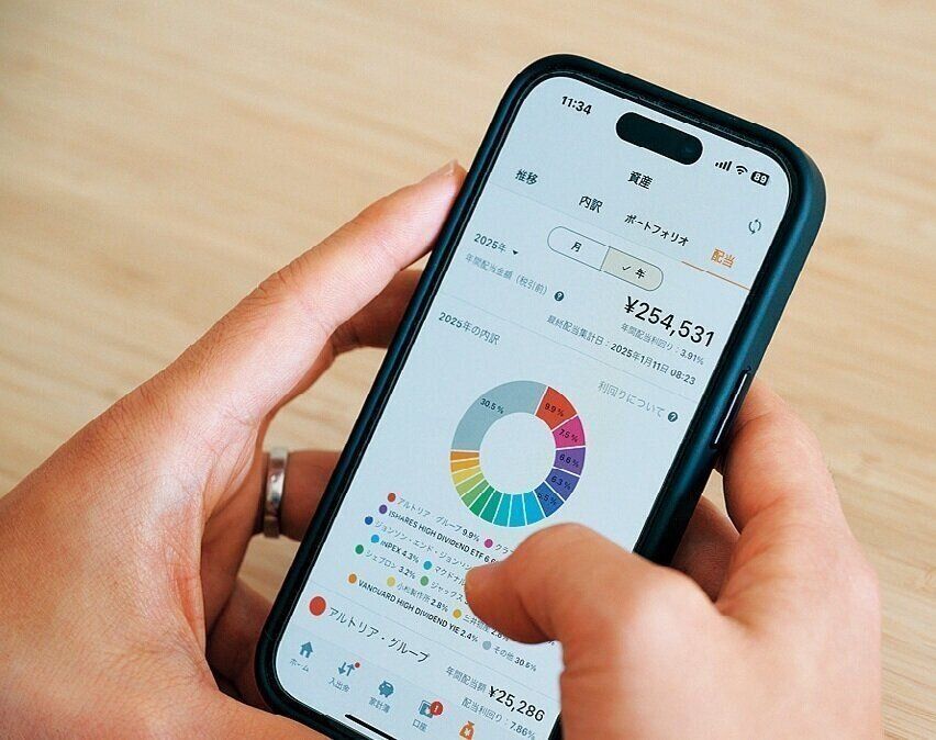 「マネーフォワード」は、夫婦で共有し、いつでもスマホで確認できるように。「証券口座もひもづけているので、資産リストが一目瞭然。どれくらい殖えたかわかって、モチベーションが高まります!」。