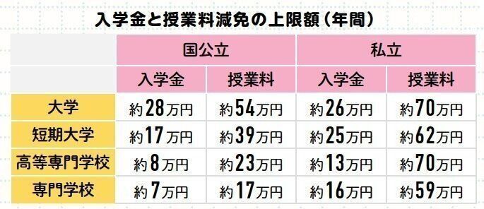 下表は年間の上限額で、国公立大の場合は4年間で約244万円、私大の場合は4年間で約306万円の免除が上限に。また、高所得の多子世帯への給付型奨学金の支援はなく、代わりに年収約800万円までは無利子の貸与型、年収約1100万円までは有利子の貸与型の奨学金が基準を満たす希望者全員に貸与されます。