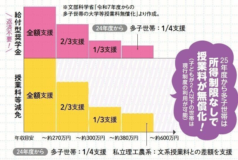 20年から始まった大学などの修学支援新制度は、大学や短大、専門学校などに通う低所得世帯の子どもを授業料&入学金の減免、給付型奨学金という2つの柱で国がサポートする制度です。当初は住民税非課税世帯やそれに準ずる世帯が対象でしたが、24年度からはそれを超える収入があっても、扶養する子どもが3人以上の多子世帯、学費が高い私大の理工農系学部に通う学生のいる世帯に支援が拡大。さらに25年度からは多子世帯の所得制限がなくなり、授業料や入学金の減免は全額支援となります。「ただし児童手当とは異なり、下の子より上の子の支援が手厚くなる設計なので、内容をきちんと理解しましょう」。