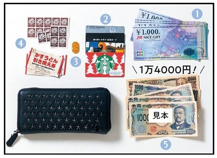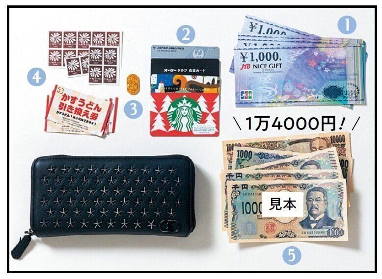 (1)商品券(親からもらった物)、(2)クレジットカード、ショップカード、(3)金運お守り、(4)クーポン券、割引券、(5)現金