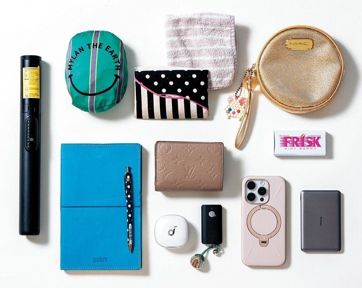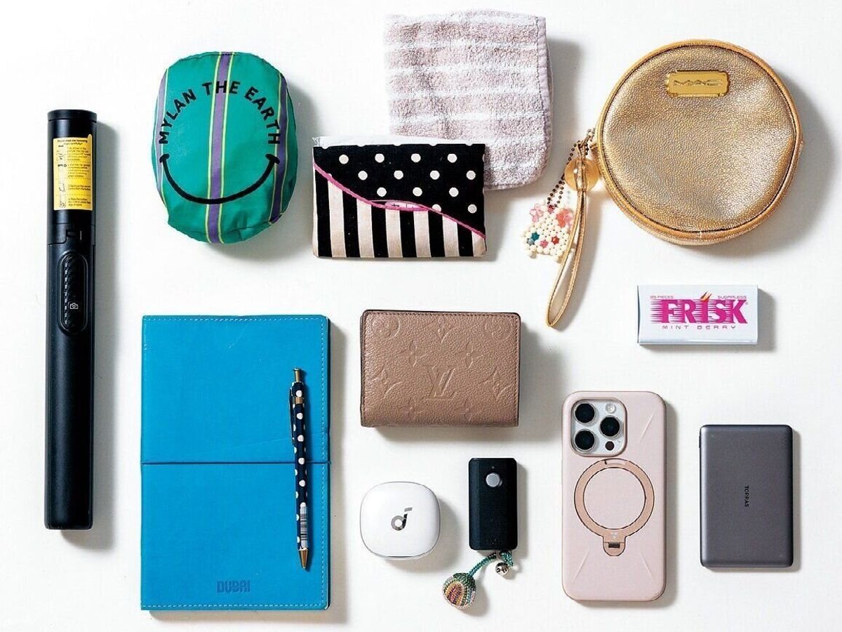 「バッグは、両手が使えるショルダータイプが基本。メイクやヘアケア品もこれさえあれば、すぐ直せるという物を絞り込んで、荷物は少なめに」。