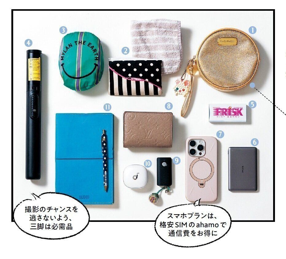 (1)化粧ポーチ、(2)ハンカチ、ティッシュ、(3)エコバッグ、(4)折り畳み三脚、(5)フリスク、(6)充電器、(7)スマホ、(8)財布、(9)家の鍵、(10)イヤホン、(11)メモ帳&ペン