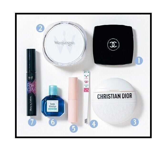 (1)ミラー、(2)ウォンジョンヨ トーンアップ フィルタークッション、(3)ボディ、フェイスクリーム、(4)毛抜き、(5)エスティーローダ リップ、(6)目薬、(7)ケープ前髪ホールドマスカラ