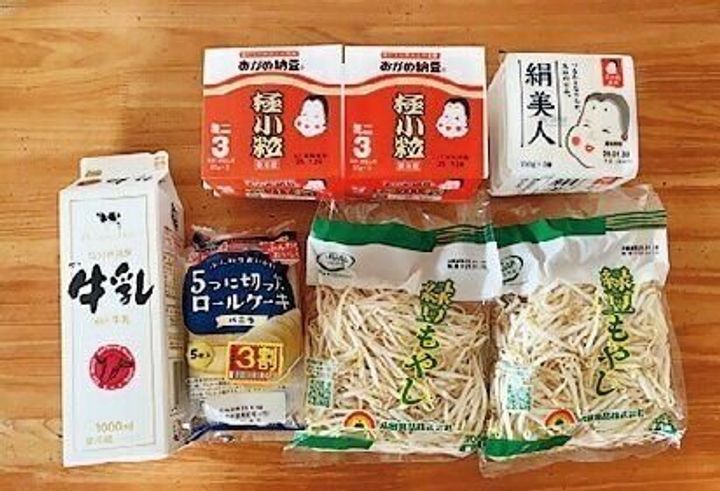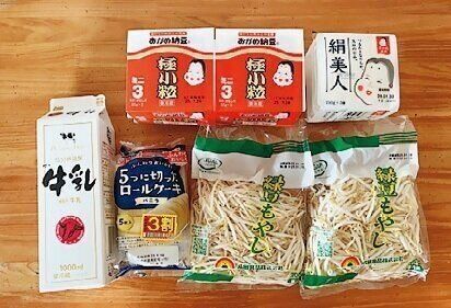 週の半ばに、納豆や牛乳などの生鮮品をドラッグストアで購入。もやしは1袋20円、見切り品のロールケーキは81円で、しめて、597円也!