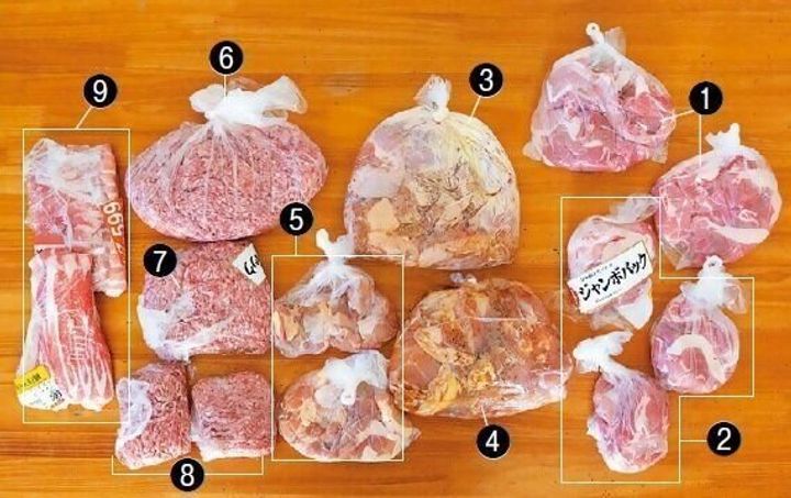 (1)豚こま(大)炒め物など主菜用(2)豚こま(小)とん汁や焼きそば用(3)鶏もも(大)から揚げ用(4)鶏もも(中)照り焼き用(5)鶏もも(小)親子丼やチキンライス用(6)豚ひき(大)ハンバーグ用(7)豚ひき(中)ミートソース用(8)豚ひき(小)そぼろ用など(9)豚バラ薄切りは、炒め物用などに