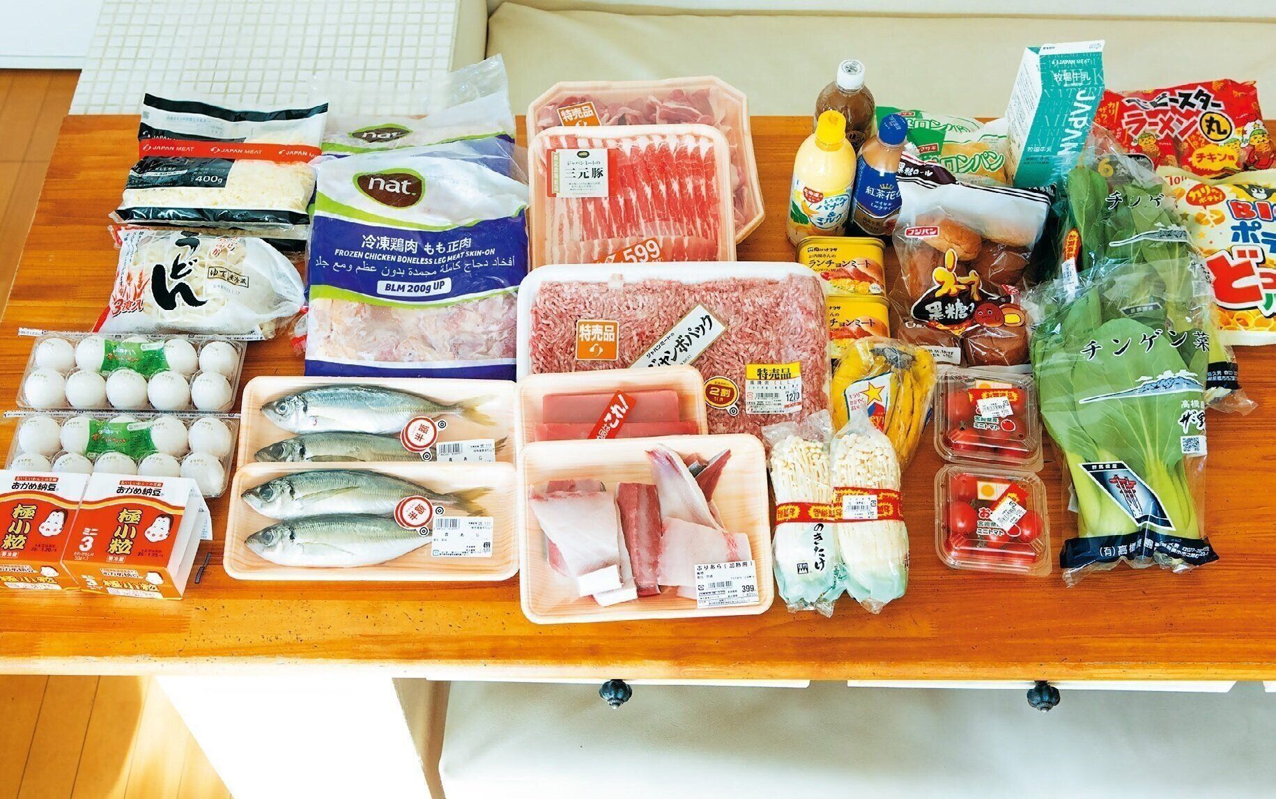 牛乳はPBブランドを選び、おやつは200円以下の大袋入りを狙います。「卵など1人1点限りの特売品は、買い物に同行する夫の分も合わせ、必ず2パック買います!」。