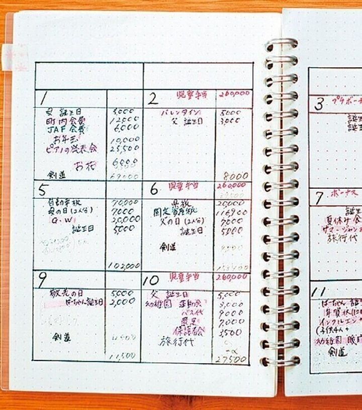 バインダーノートに年間でかかる特別出費の表や、子どもの入園・入学時期などを書き出すライフプラン表を作成。「先々の予定を見通して備えているので、支出が増えても焦りません」。