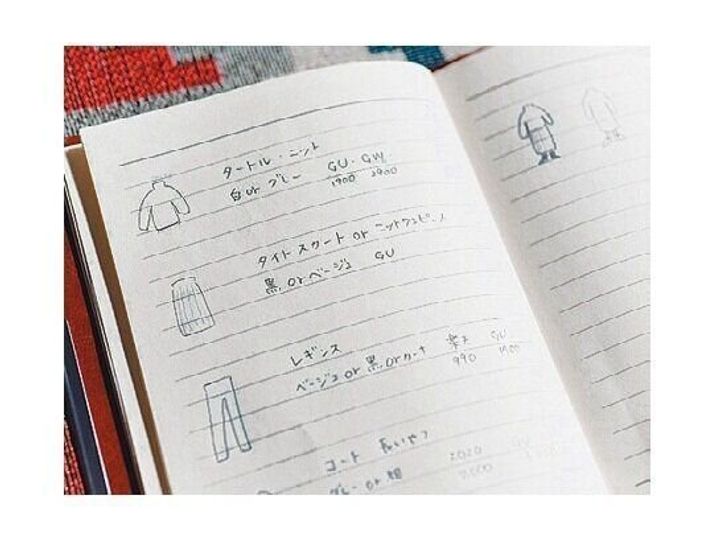 洋服が欲しくなったら、手持ちの服を確認し、着回し例をノートにメモ。「2パターン以上着回しできる物だけ選ぶことで、買い物の失敗がなくなり、ムダ買い予防にも効果大でした」。