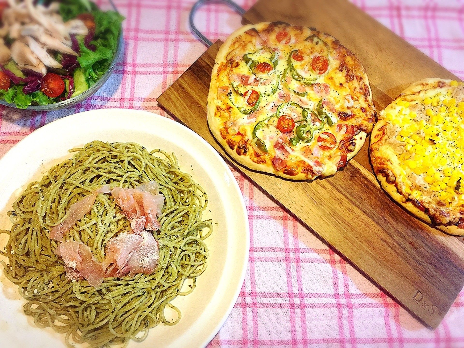 サンキュ!ブロガーMIYUさんの子どもは中1と小4の2人姉弟家族で、食費月48,000円で予算を組んでいます。食べるのは大好き!だけども外食になると金額が跳ね上がる...となればここでおうち外食の出番です!ピザはホームベーカリーで簡単に生地を作れますし、パスタのジェノベーゼは80円でゲットしたバジルでソースを作っています。
