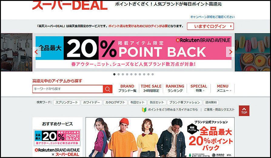 スーパーDEALとは、そのページから対象の商品を購入すると一部がポイントで還元されるサービス。楽天会員なら誰でも年中利用できます。購入価格の最大50%ポイントバック、つまり実際に定価購入でもその分のポイントをもらえるうれしい仕組み