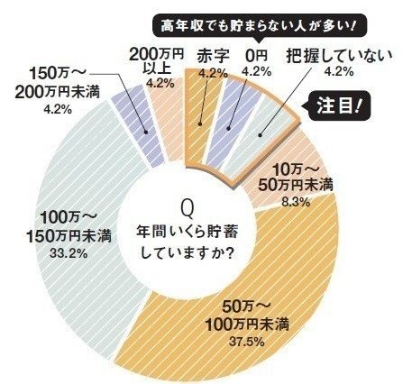 そこで、創刊以来22年間マネー情報を取材し続けてきた『サンキュ!』編集部が、読者192人のアンケートから、貯まる人、貯まらない人、それぞれの傾向を年収別に分析しました。