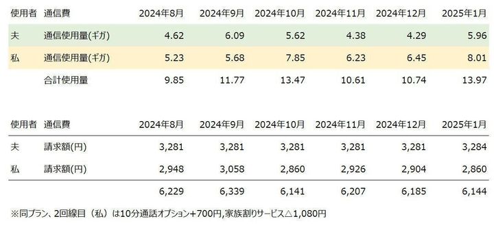 今までのプランでは夫も私も15ギガのプランだったのですが、実際の通信使用量を確認してみると2人とも4ギガ以上・9ギガ未満。主人はアプリ以外で通話機能を使うことはありませんが、私はアプリの無料通話では電話をかけられない会社・学校などへの通話が定期的にあるため、10分~30分未満の通話オプションはやはり必須なことがわかりました。