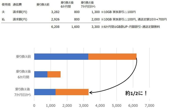 10ギガのプランに、私だけ通話定額10分+を追加する場合、最大6ヵ月間20ギガ800円と信じられないほど安いのですが、7ヵ月以降も乗り換え前と比べて夫婦合計の通信費が約6200円から3,300円と約2分の1にダウンするという試算になりました。