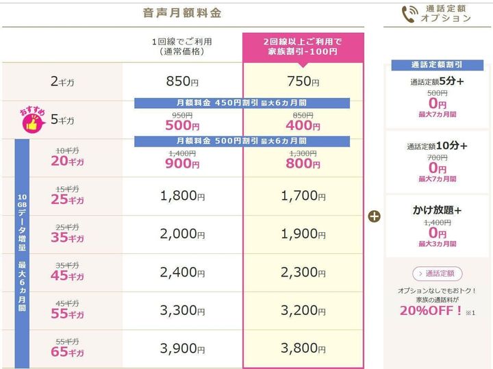 通常のプランでもお得なのですが、最大6ヵ月間が割引になる乗り換えキャンペーンがお得過ぎました!私のように10ギガと選択した場合、なんと10ギガ→20ギガに増量かつ月額料金1,400円→800円になり、通話定額オプションが無料で使えます。乗り換えの初期費用はここで完全にペイできてしまうというわけです。