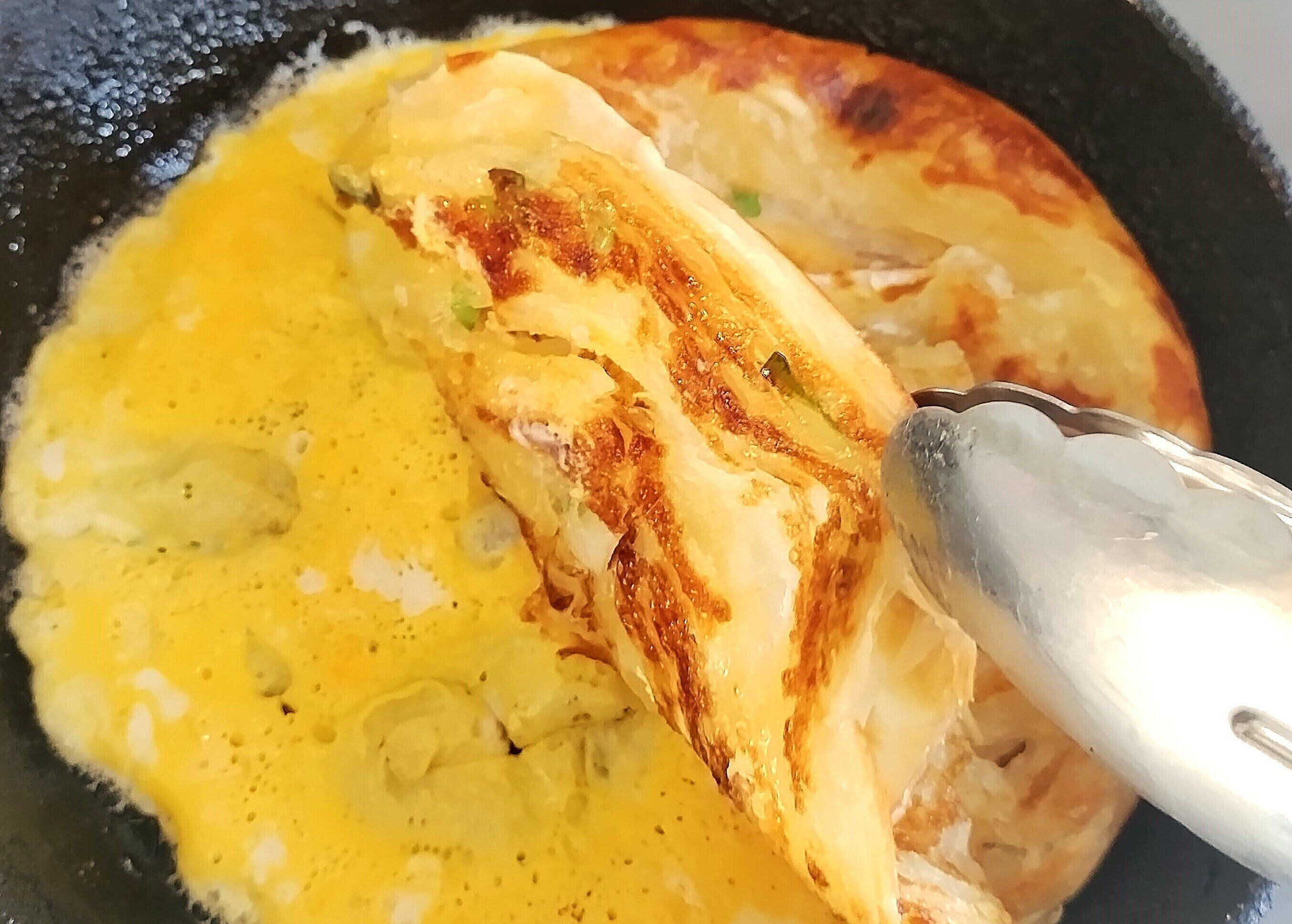 卵を溶いて、フライパンに入れます。少し火が通ったら、焼いた薄焼き餅を上からのせます。薄焼き餅と卵がくっつくくらい火を通したら完成。