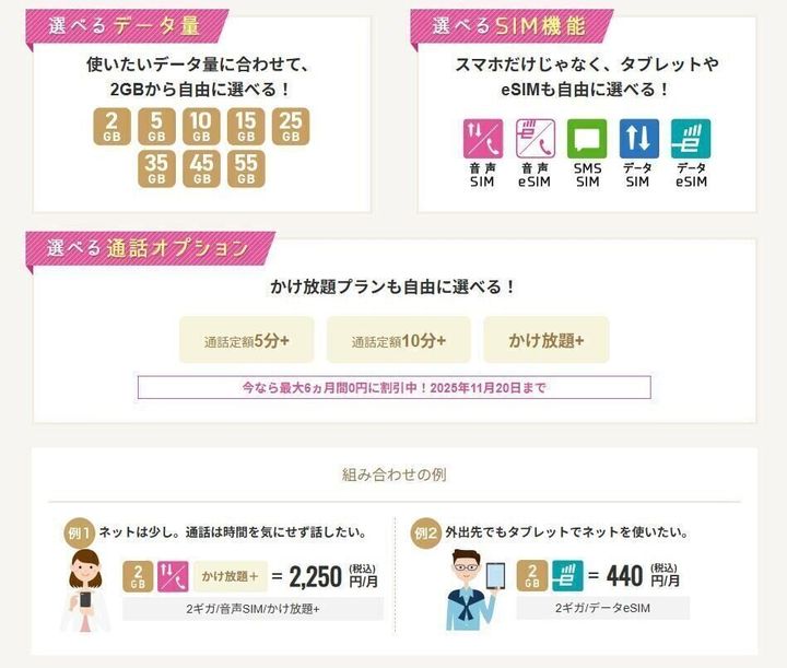 逆に移動が多く動画をたくさん見る人は大容量のプランが選択できます。2、5、10、15、25、35、45、55ギガと、かなり細かく分かれているのも特徴のひとつ。