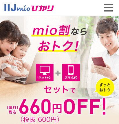 SIMと光回線をセットで契約すると、毎月ずーっと660円割引になる『mio割』が第2位にランクインしました!毎月ずーっと660円の割引が入るのは嬉しいですよね。