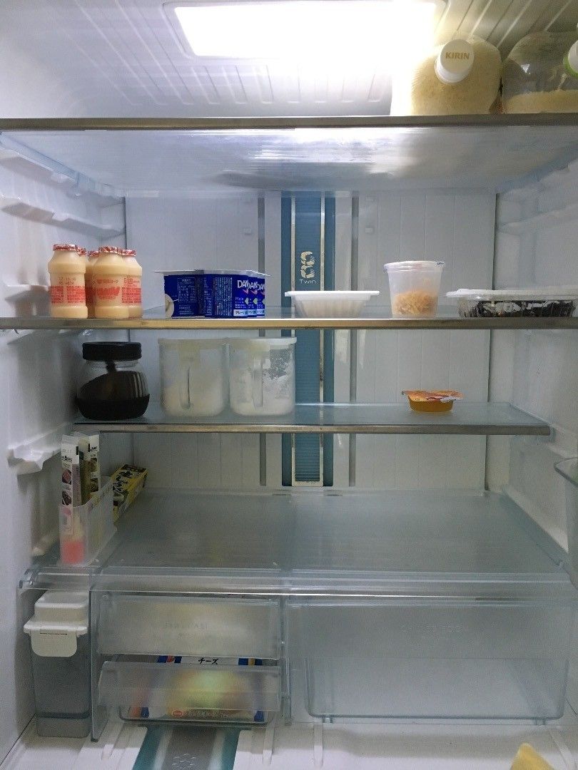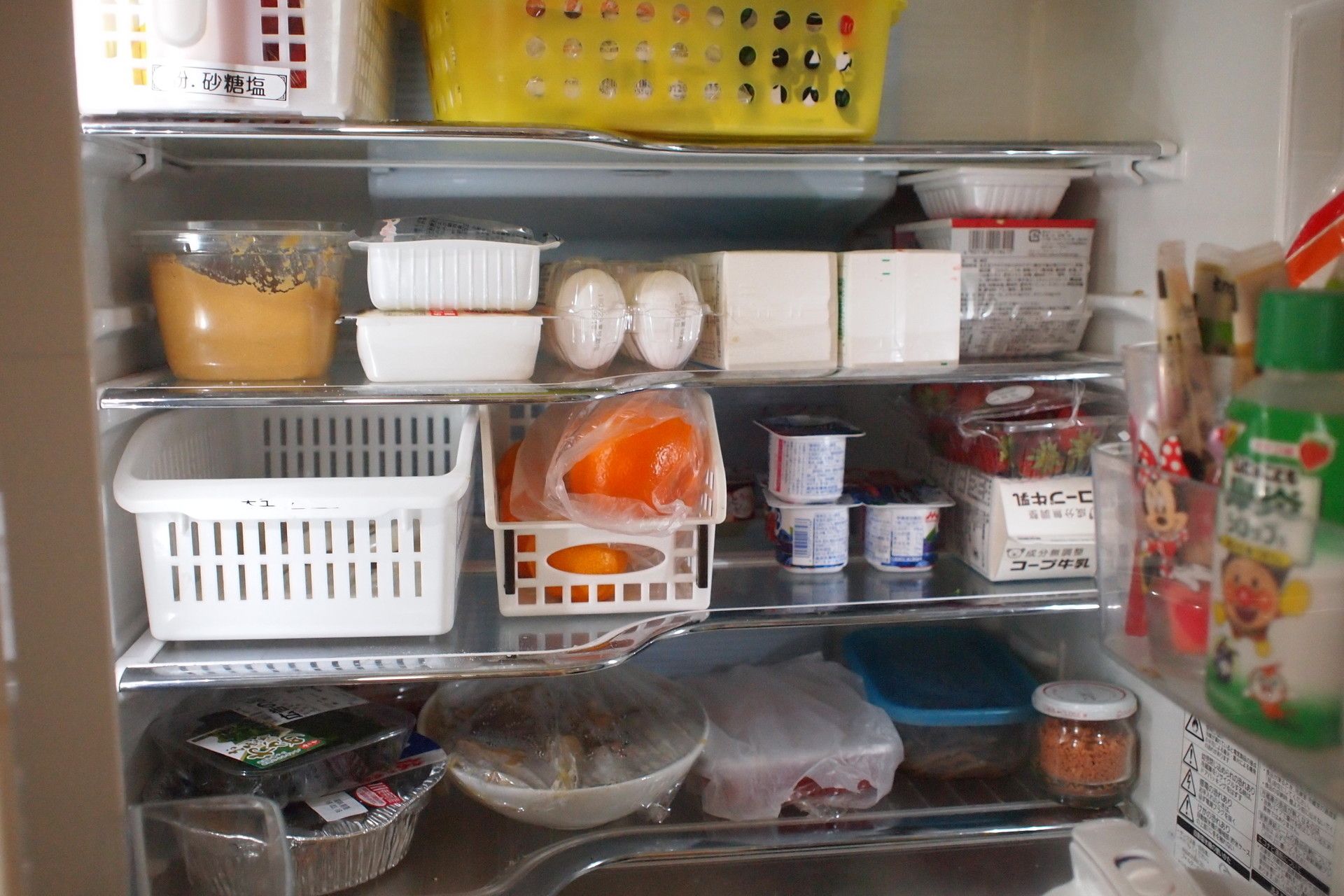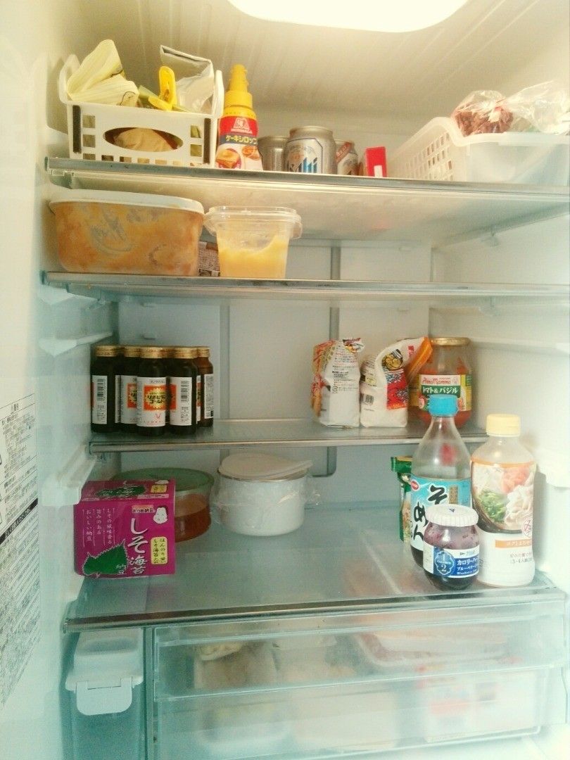 まとめ買いをするタイプの堀江麻衣さんは、冷蔵庫はできるだけすっからかんに、冷凍庫はパンパンにしておくことで、買った食材を無駄にしないようにしています。冷蔵庫の中は、ダイソーのカゴにこまごましたものをまとめて分かりやすく整理。また、鍋などをそのまま入れられるよう、一番下の板を外しているところもポイントです。