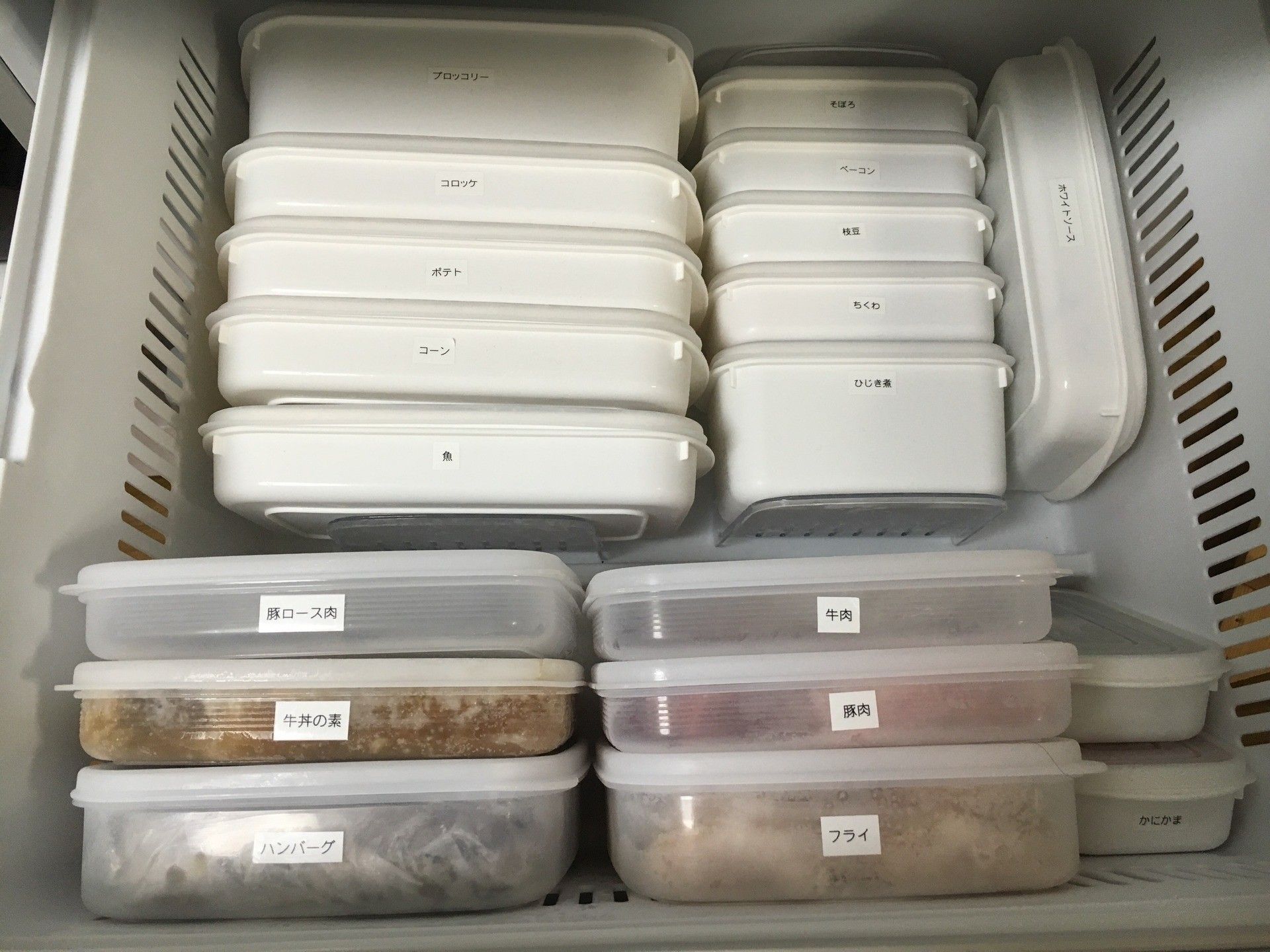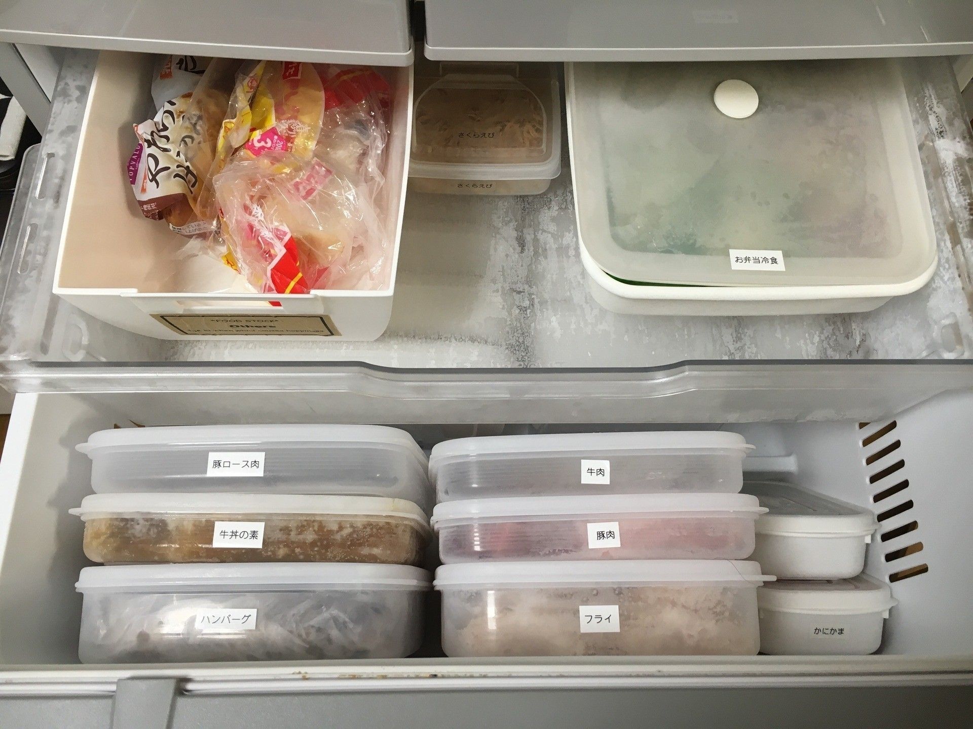Hitomiさんは、タッパーに食材名のラベルをつけて、中に何が入っているのか分かりやすいように冷凍保存しています。タッパー1つ1つが食材の部屋になっているので、使いたい食材をすぐ把握でき、取り出しやすく使いやすい♪肉や魚は下味をつけた状態で、ハンバーグやお弁当用のおかずは調理した状態で冷凍しておくと便利だそうですよ。