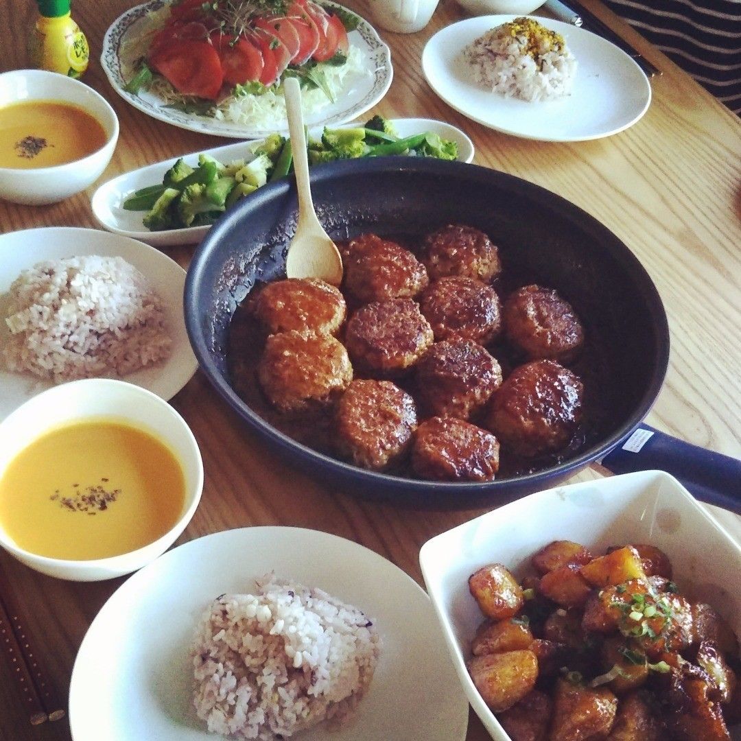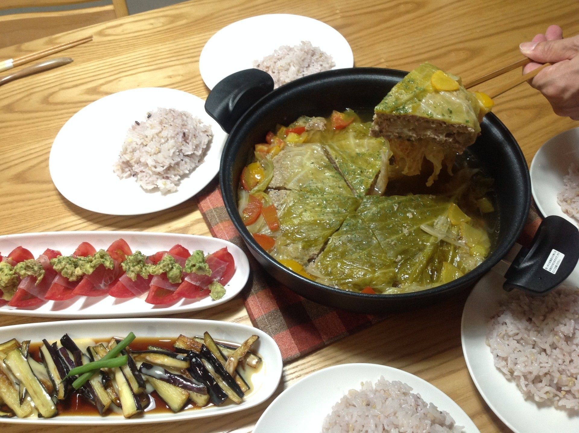 時間がある週末は煮込み料理の出番。この日作ったのは、キャベツのミルフィーユ。キャベツとハンバーグのタネを重ね、トマトとコンソメでコトコト煮込んだ心も温まるメニューですね。季節の野菜も副菜として活躍しています。