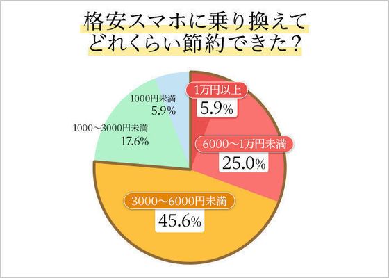 格安スマホに換えて節約できた金額は、月3000~6000円未満が最も多く、約46%。6000円以上節約できたという人も約30%いました!