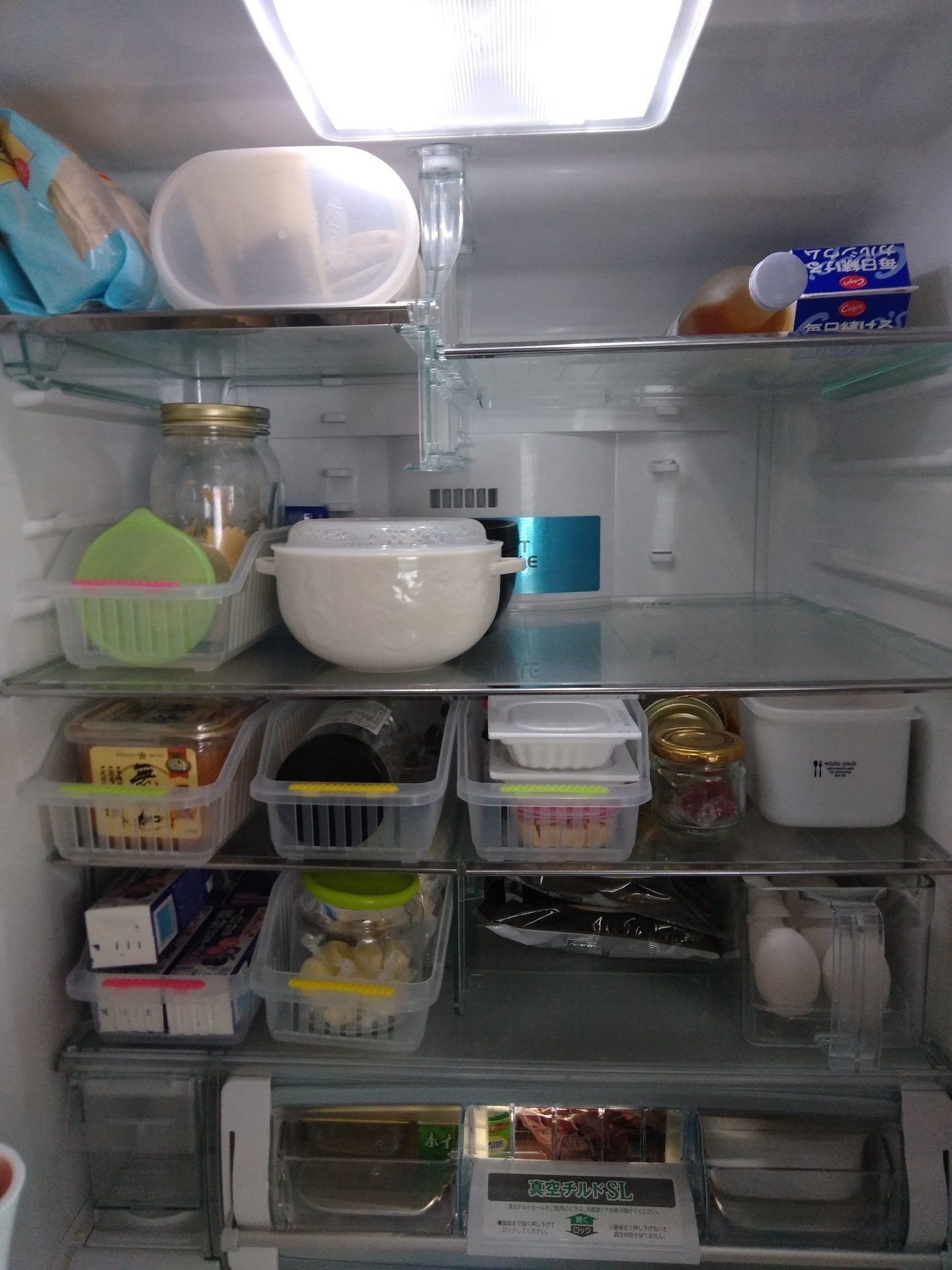 棚を1段減らして空間を広くし、冷蔵庫の中を見通しやすくしている中野めぐみさん。スペースが縦に広いので、背の高い牛乳パックやラべリングした常備菜入りの容器も縦に重ねて収納でき、空間を無駄なく活用して収納しています。冷蔵庫の中がキレイに見通せることで、使えていなかった食材も減ったのだとか♪