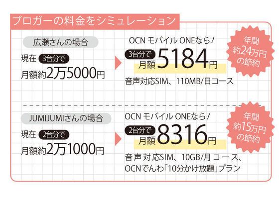 「格安SIMの会社は、大手キャリアから回線を借りていて、必要なサービスだけにしぼっているので、料金が安くできるんです。OCN モバイル ONEの場合、今使っているのと同じようなプランで、半額以下に抑えることも可能です」(丸山さん)