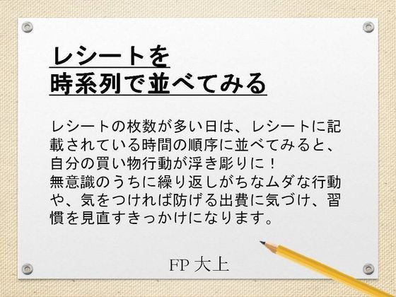 大上:レシートを集めて「意外と多い」と感じたということは、無意識のうちに使いすぎているか、使途不明金が多い証拠。幸いレシートには、買った日付や時間、お店や品目も全て記録されています。さっそく、中身や自分の行動パターンを振り返り、ムダな部分をチェックしていきましょう!