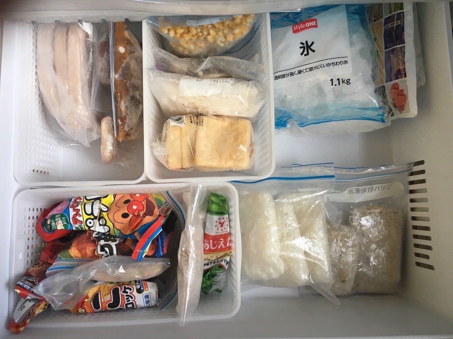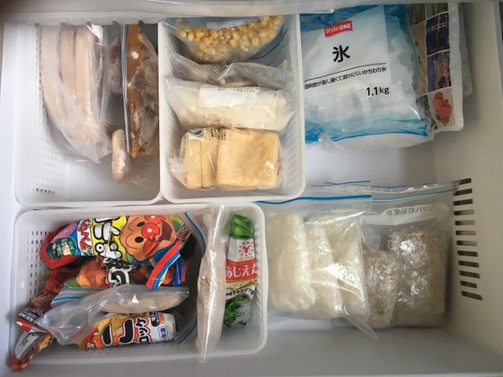 ここゆきさんは1週間~10日に1度、冷蔵庫の食材を一掃する日と、もう一日冷凍庫の中身と乾物だけで夕食をつくってみる日を設けています。冷凍庫に常備しているのは、肉や油揚げ、きのこ、枝豆など。乾物と組み合わせれば、ハンバーグやサラダスパゲティ、ナムル、いなり寿司などの料理がつくれ、乾物の賞味期限切れ予防にもなるそうです。
