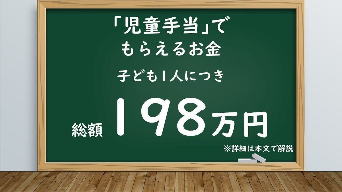子ども1人につき、中学校卒業までの支給総額は198万円(第1子、第2子の場合)。