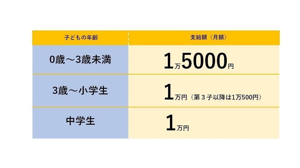 3歳未満の子どもがいる世帯は子ども1人につき月額1万5000円。3歳〜小学生は子ども1人につき月額1万円(第3子以降は月額1万5000円)。中学生は子ども1人につき月額1万円です。