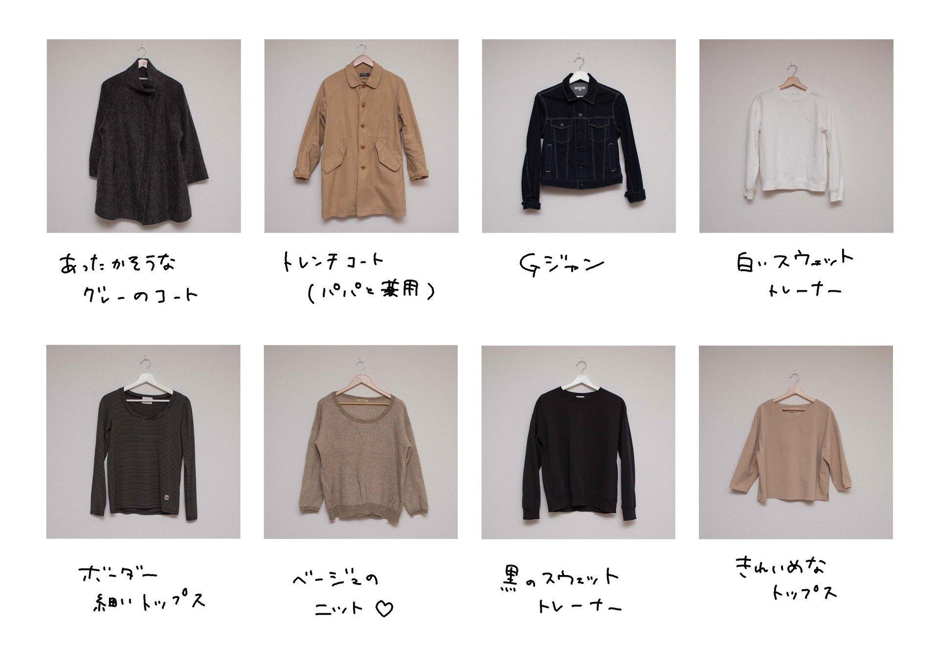 かつママさんの所有する服はかなりシンプルでベーシックなものばかり。着回し力のある服を厳選することで、無駄な買い物がなくなり、朝の支度の時短につながりました。小物使いでアレンジも自由自在です。