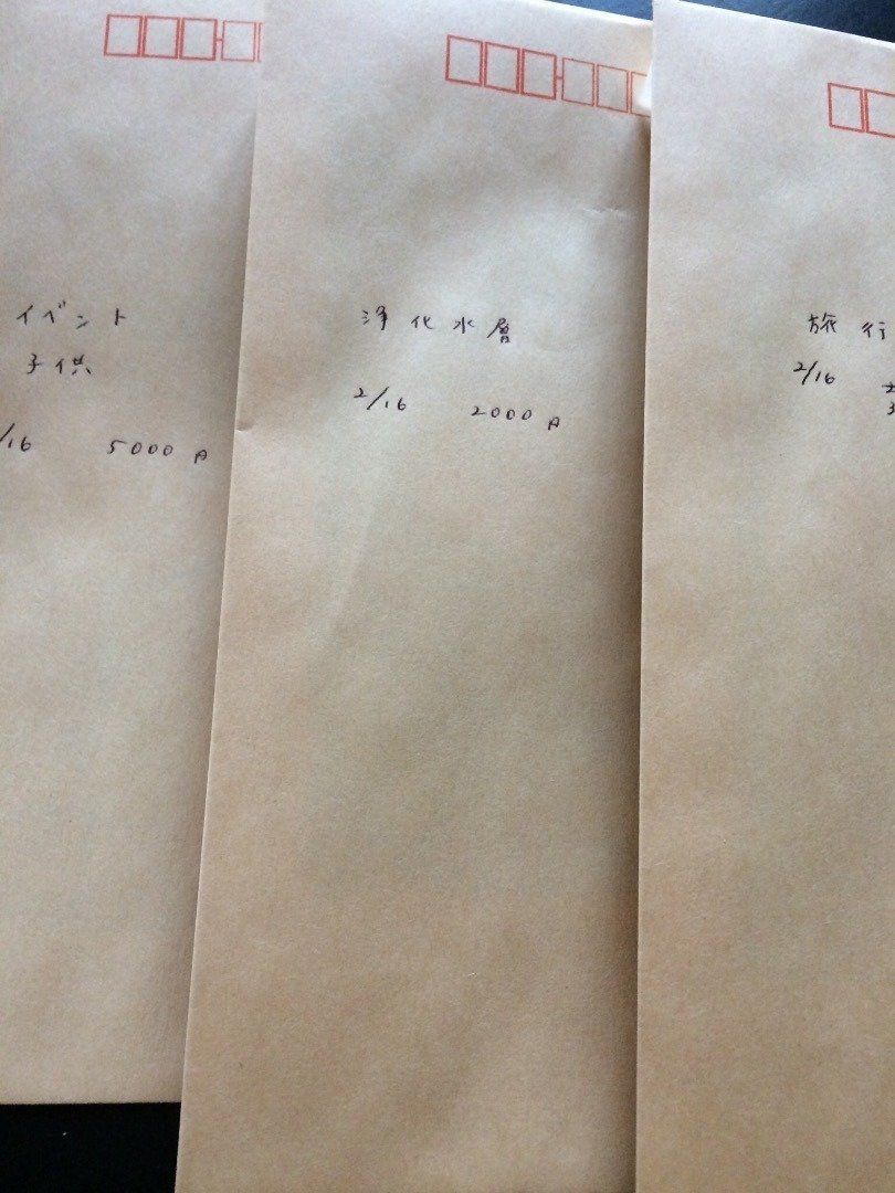 りりーさん家では車検や車の保険代などの特別出費は、専用の積み立て口座に先取貯金で貯めています。今回、その口座とは別に子どもイベント費、浄化水槽費、旅行費の積み立てもスタートしました!自宅にあった封筒を使い、費目ごとに分けて表面にお金を入れた日付と金額を記入するようにして管理しているそうです。
