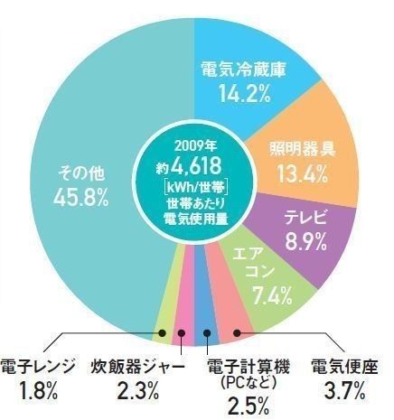 10年前はエアコンの消費電力がNo.1でしたが、今は省エネに。とはいえ、夏はエアコンの消費電力が半分以上を占めるので、対策はマスト!また、意外と消費電力が高い照明は、白熱電球をLED電球に替えることで大幅な節約に。