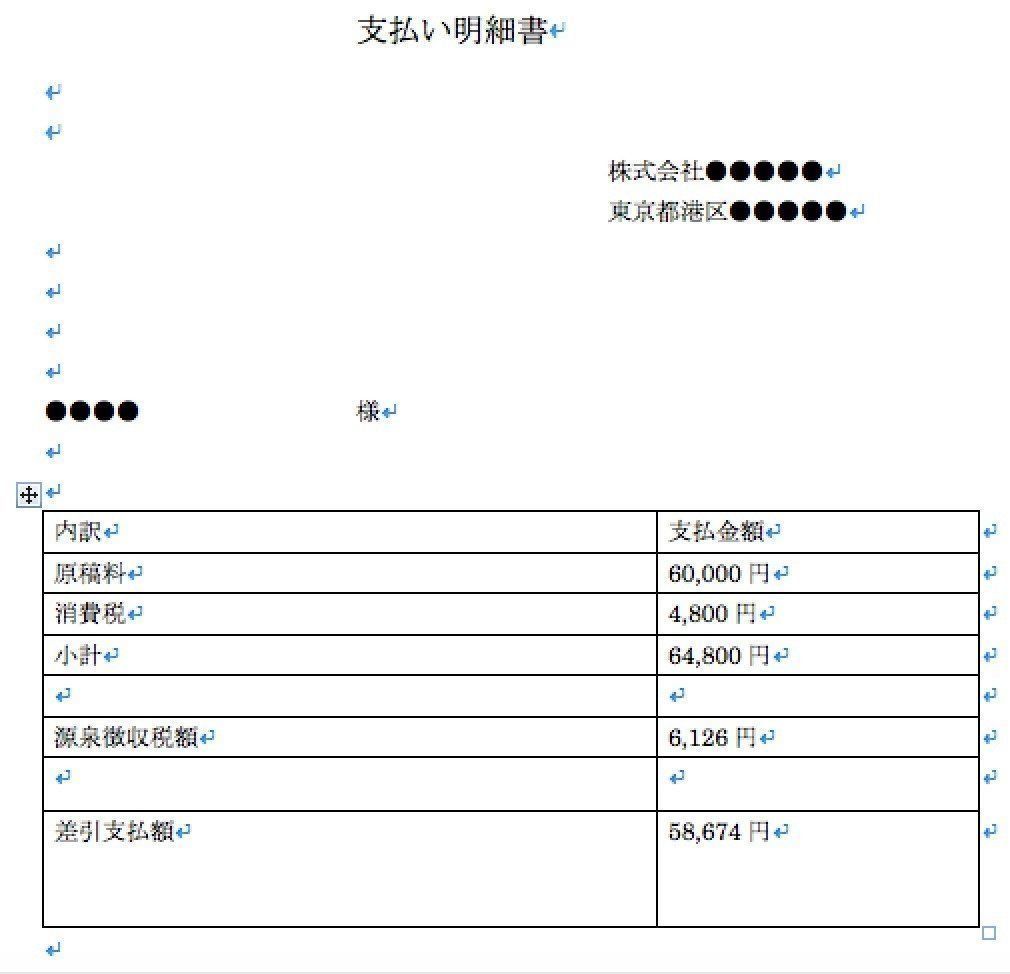 上の場合、原稿料の小計6万4800円が支払金額、6126円が源泉徴収税額になります。消費税がプラスされた6万4800円から源泉徴収税額6126円が控除されて、差引支払額が5万8674円となります。