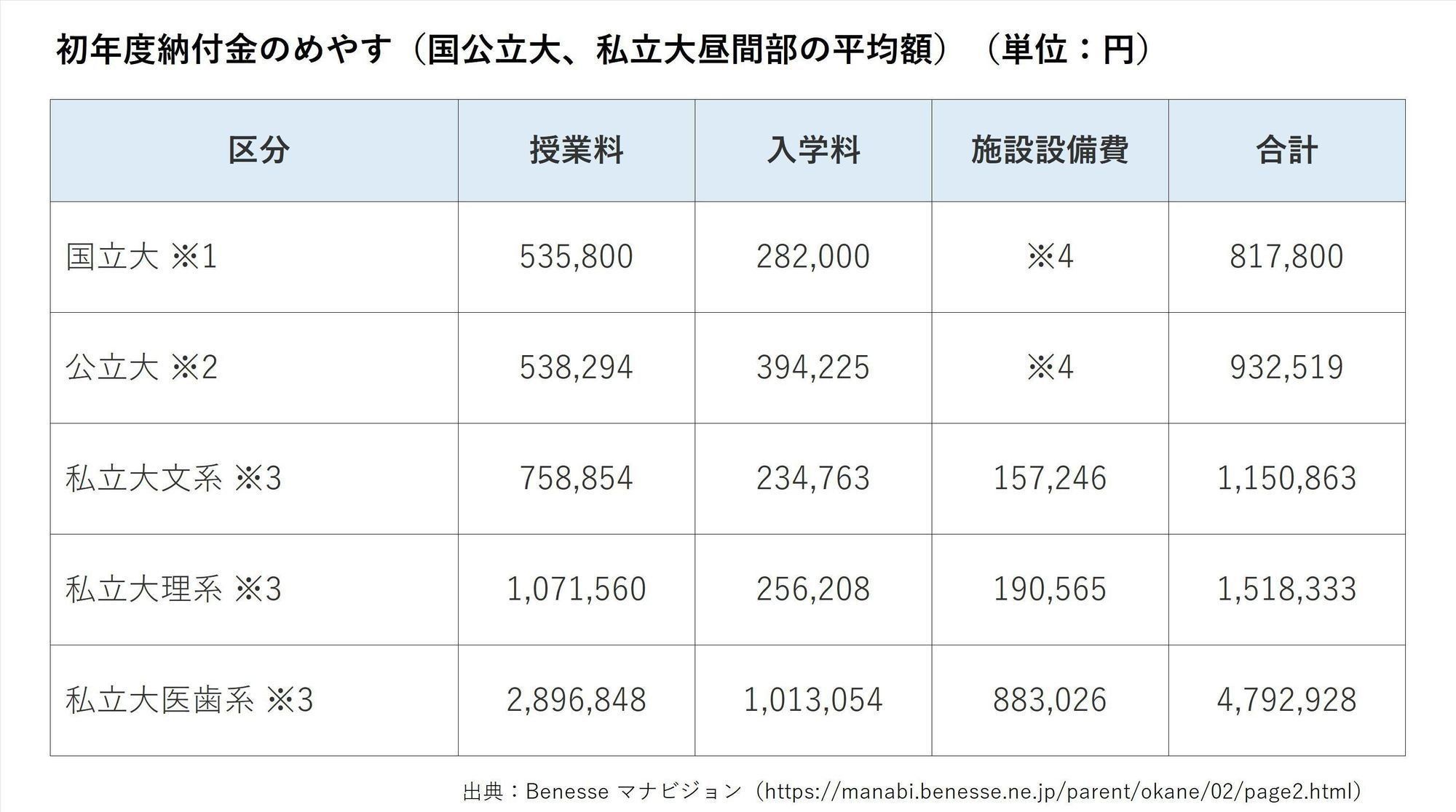 ※3 文部科学省「平成28年度私立大学入学者に係る初年度学生納付金平均額調査」。私立大昼間部の平均額。 ※4 施設費、実習費、諸会費などを徴収される場合がある。