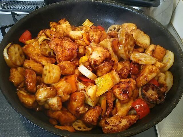 おとわれいさんの家では、市販の黒酢あんをつかった料理が家族に大好評!鶏むね肉を5枚も使い、ボリュームたっぷりです。鶏むね肉はお財布にやさしいので、おとわれいさんのお気に入りなんだとか。食費を上手に節約していますね。