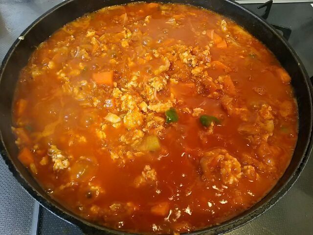 業務用レトルトのストックもしっかりとある、おとわれいさん。6人前のミートソースを、鶏ひき肉や冷蔵庫にある残りものの野菜をみじん切りにしてかさましします。水分で味がうすまった場合は、ケチャップや塩コショウで味を調整。レトルトを使いながらも、栄養や愛情がつまった最高の一品ができあがりました。